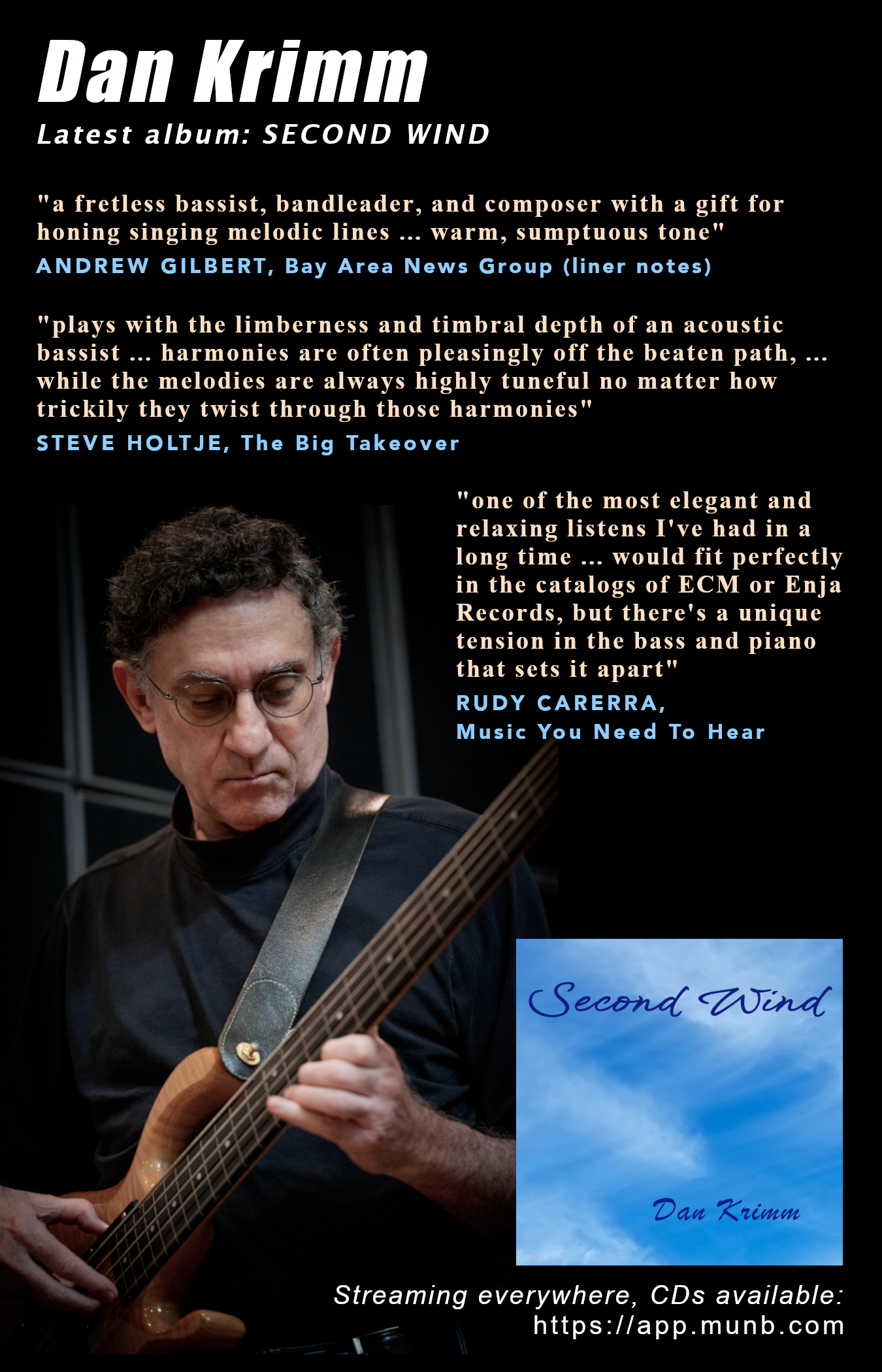 "Dan Krimm, an electric fretless bassist of great sensitivity ... plays with the limberness